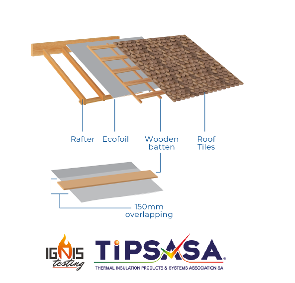 Ecofoil Radiant Barrier has been specially formulated for use under cement and concrete roof tiles to insulate the roof space, to prevent tiles lifting due to wind gusting and to prevent the ingress of wind driven rain.
